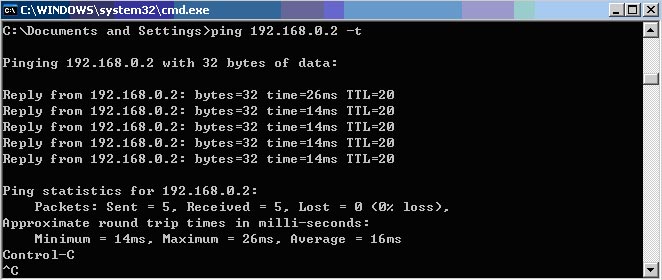 2. PING開發(fā)板:輸入命令ping 192.168.0.2 -t