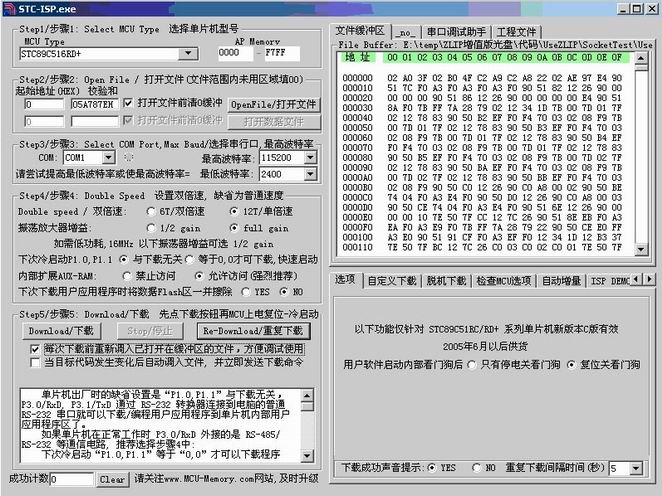 V391.exe”,點擊“OpenFile/打開文件”按鈕,打開剛剛產(chǎn)生的UseZLIPLib.hex文件,并設置MCU Type為STC89C516RD+,最后界面如下: