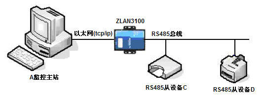 圖3表示的是通常的RS485的系統(tǒng)結(jié)構(gòu),其中包含一臺(tái)監(jiān)控主機(jī)和多臺(tái)RS485設(shè)備,轉(zhuǎn)化為tcp/ip后有兩種方式,分別為圖4的總線結(jié)構(gòu)和圖5的多設(shè)備結(jié)構(gòu)。在總線結(jié)構(gòu)中,系統(tǒng)中和監(jiān)控主機(jī)相連的RS485線被ZLAN3100轉(zhuǎn)換器轉(zhuǎn)化為網(wǎng)線,利用卓嵐ZLVircom驅(qū)動(dòng)可以將該網(wǎng)線虛擬為一個(gè)串口例如COM5。軟件系統(tǒng)和圖3一樣工作;在多設(shè)備結(jié)構(gòu)口中,在離設(shè)備很近的地方將網(wǎng)線轉(zhuǎn)化為RS485,每個(gè)設(shè)備都需要一個(gè)ZLAN3100轉(zhuǎn)換器,ZLVircom支持將兩個(gè)ZLAN3100綁定在一個(gè)虛擬串口上,也就是說系統(tǒng)中有兩個(gè)轉(zhuǎn)換器但是都是對(duì)應(yīng)COM5這一個(gè)虛擬串口,軟件和圖3一樣工作。