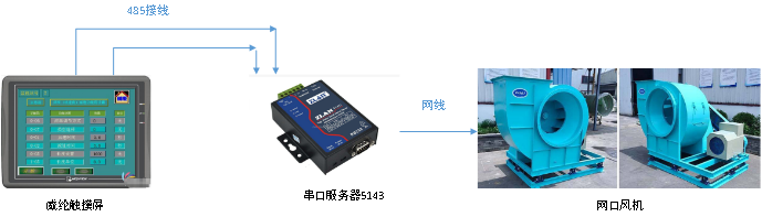 風(fēng)機(jī)是量大面廣的通用性設(shè)備,廣泛用于工廠、礦井、隧道、冷卻塔、車輛、船舶和建筑物的通風(fēng)、排塵和冷卻;鍋爐和工業(yè)爐窯的通風(fēng)和引風(fēng);空氣調(diào)節(jié)設(shè)備和家用電器設(shè)備中的冷卻和通風(fēng);谷物的烘干和選送;風(fēng)洞風(fēng)源和氣墊船的充氣和推進(jìn)。本次案例主要介紹威綸觸摸屏通過串口服務(wù)