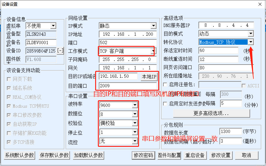 2.設(shè)備端口號(hào)要和風(fēng)機(jī)從站設(shè)置成一致的。