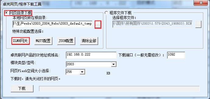 這里選擇“網(wǎng)頁目錄下載”,并且點擊“…”,選擇一個之前新建的空目錄,用于存放配置信息。然后點擊“ZLMB網(wǎng)關(guān)”按鈕,彈出如下對話框: