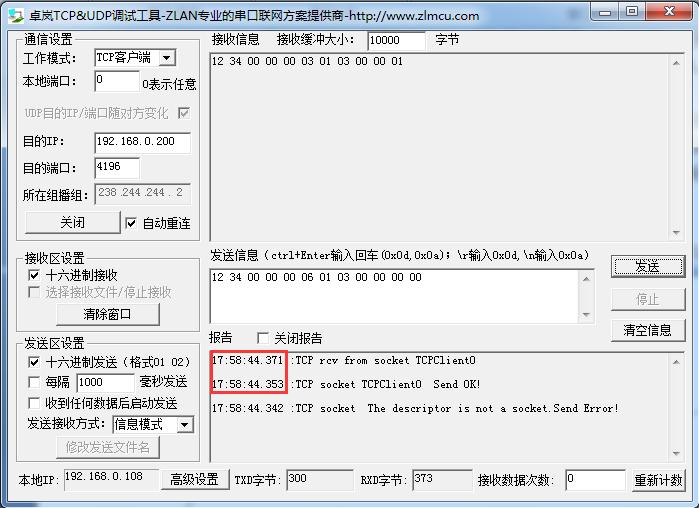 如圖所示,可配置Modbus網(wǎng)關(guān)實現(xiàn)了站地址1、站地址3這兩個RTU Modbus的數(shù)據(jù)合并,將其合并到寄存器0~7整片區(qū)域,實現(xiàn)指令合并功能。 使用SockeDlgTest連接上192.168.0.200的4196端口發(fā)送12 34 00 00 00 06 01 03 00 00 00 00指令,立即返回數(shù)據(jù)。