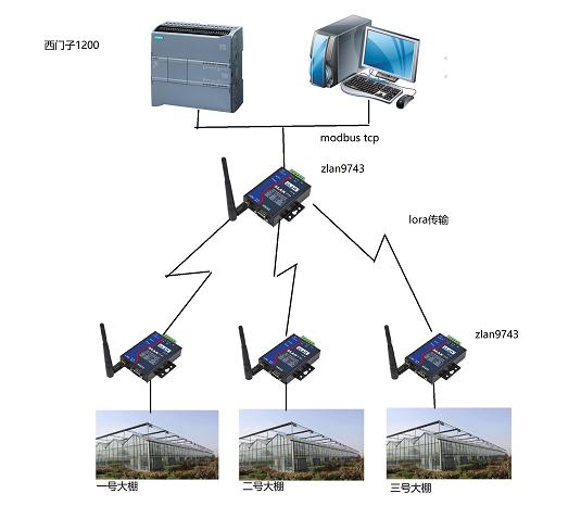 1.大棚端將lora網(wǎng)關(guān)通過485雙絞線和大棚內(nèi)的485串口儀表,采集器和風(fēng)機(jī)等設(shè)備手拉手連接。