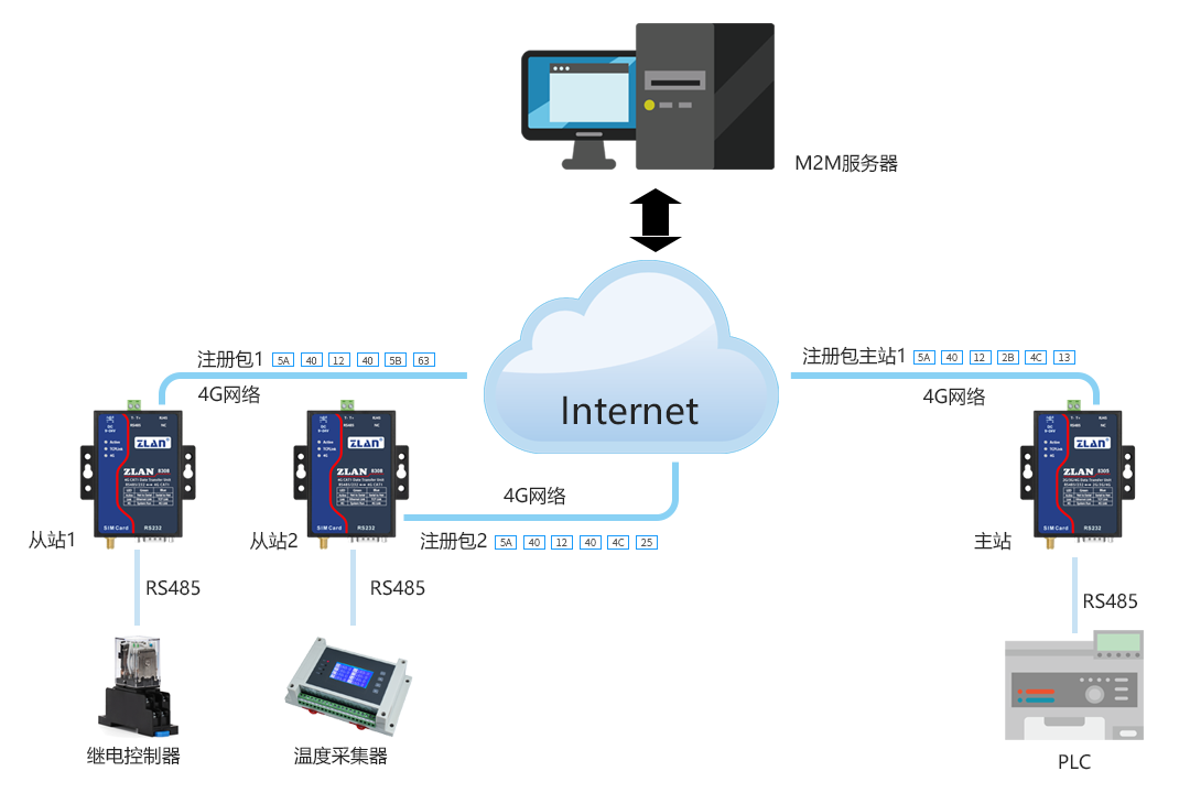 如圖,PLC主站原來(lái)通過(guò)RS485 總線和繼電器控制器和溫度采集器連接?,F(xiàn)在通過(guò)3個(gè)4G DTU,然后借助M2M 的服務(wù)器,轉(zhuǎn)發(fā)所需的控制命令,實(shí)現(xiàn)通過(guò)Internet的連接。使用時(shí)首先在M2M服務(wù)器中登記主站的注冊(cè)包“注冊(cè)包主站1”,以及兩個(gè)從站的注冊(cè)包“注冊(cè)包1”和“注冊(cè)包2”,當(dāng)設(shè)備和M2M服務(wù)器建立TCP連接后,立即發(fā)送相應(yīng)注冊(cè)包。 M2M 服務(wù)器識(shí)別了設(shè)備身份后可以進(jìn)行相應(yīng)的數(shù)據(jù)轉(zhuǎn)發(fā)功能??梢詫?shí)現(xiàn)一個(gè)主站多個(gè)從站的數(shù)據(jù)轉(zhuǎn)發(fā)功能。