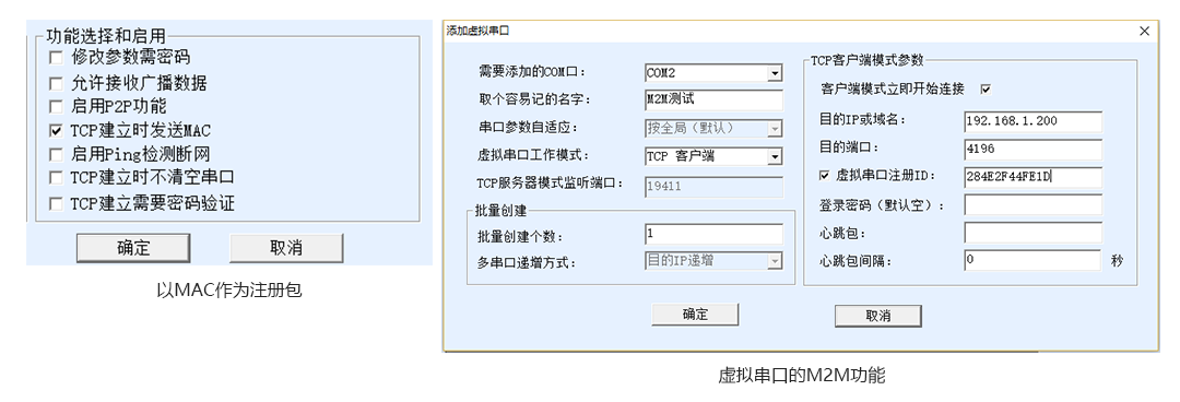 對(duì)于4G DTU一般使用注冊(cè)包,如果是ZLAN5103等串口服務(wù)器,可以使用連接上發(fā)送MAC 地址功能更方便,如圖所示。另外也可以通過(guò)M2M功能實(shí)現(xiàn)計(jì)算機(jī)的虛擬串口和卓嵐設(shè)備的連接,即在虛擬串口作為T(mén)CP客戶端的情況下設(shè)置一個(gè)注冊(cè)包。