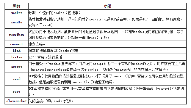socket是通用的TCP/UDP調(diào)用接口,含有的主要主要函數(shù)如表所示:
