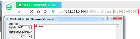 以上的方法只是實(shí)現(xiàn)了數(shù)據(jù)從串口到網(wǎng)絡(luò)時(shí),串口hex數(shù)據(jù)轉(zhuǎn)變?yōu)镚ET命令的功能。但是如果Web服務(wù)需要按照GET命令下發(fā)數(shù)據(jù),此時(shí)也需要將其中的某部分?jǐn)?shù)據(jù)轉(zhuǎn)發(fā)到串口。例如:當(dāng)Web服務(wù)器向物聯(lián)網(wǎng)網(wǎng)關(guān)(IP地址為192.168.0.200)的端口8080發(fā)送GET命令時(shí),GET命令中的有效數(shù)據(jù)(這里是61626364656667)被轉(zhuǎn)化為十六進(jìn)制數(shù)據(jù)(abcdefg)從網(wǎng)關(guān)的串口輸出,發(fā)給控制器、執(zhí)行器。如下圖所示: