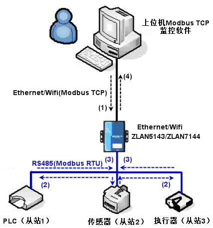如圖所示:普通的Modbus TCP數(shù)據(jù)流方向為(1)到(2)到(3)到(4)。即先將Modbus TCP指令轉(zhuǎn)化為Modbus RTU的對應(yīng)指令,然后設(shè)備應(yīng)答Modbus RTU指令給Modbus網(wǎng)關(guān),然后Modbus網(wǎng)關(guān)再次轉(zhuǎn)化為Modbus TCP發(fā)送給監(jiān)控上位機。