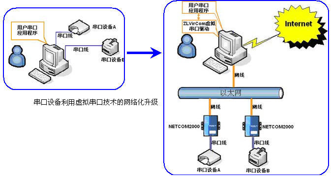 1. 應(yīng)用軟件的延續(xù)性。用戶軟件原來(lái)使用串口通信(COM1等),現(xiàn)在升級(jí)為網(wǎng)絡(luò)方式通信后,用戶的軟件不想重新編寫(xiě)。此時(shí)使用虛擬串口技術(shù)創(chuàng)建一個(gè)虛擬串口(計(jì)算機(jī)上原來(lái)沒(méi)有的COM5等),用戶軟件打開(kāi)COM5即可和以前一樣使用。極大地加快項(xiàng)目進(jìn)度、產(chǎn)品上市。