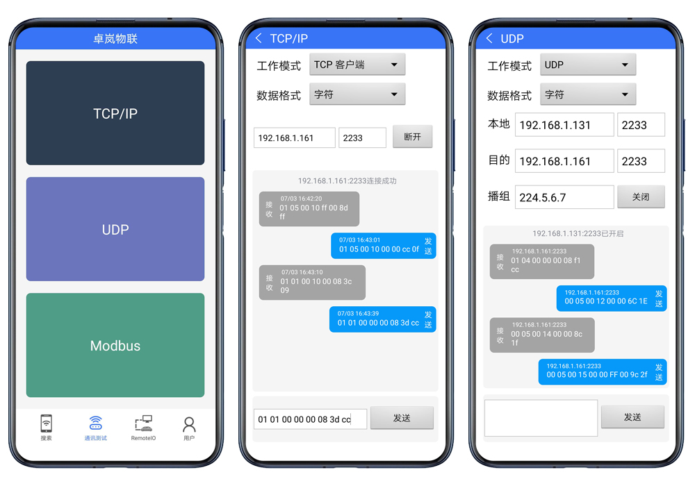 卓嵐手機(jī)APP “卓嵐物聯(lián)”上線啦, 這是一款卓嵐為方便用戶而開(kāi)發(fā)的手機(jī)端vircom配置設(shè)備參數(shù)和測(cè)試通訊的手機(jī)軟件,它全面集成 TCP客戶端/服務(wù)端; UDP客戶端/服務(wù)端; UDP廣播/組播功能 ,Modbus測(cè)試軟件功能,以及卓嵐RemoteIO軟件功能,用戶不僅可以方便用手機(jī)的搜索、設(shè)置卓嵐公司旗下所有的設(shè)備,還可通過(guò)該軟件進(jìn)行手機(jī)端的TCP UDP的網(wǎng)絡(luò)調(diào)試通信以及modbus通訊調(diào)試,是一款智能的手機(jī)端調(diào)試軟件app。