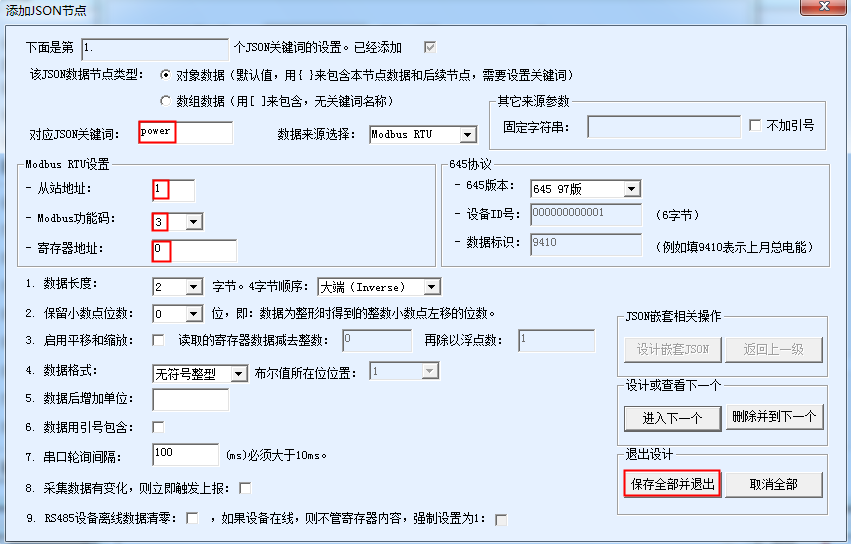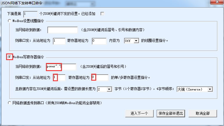 這里選擇“Modbus寫(xiě)寄存器指令”,在收到數(shù)據(jù)中填寫(xiě)“power”:””(這里特別注意在關(guān)鍵詞power后面增加一個(gè)雙引號(hào)、冒號(hào)和雙引號(hào)。然后填寫(xiě)這個(gè)關(guān)鍵詞對(duì)應(yīng)的站地址和寄存器地址,分別為1和0。點(diǎn)擊“保存全部并退出”?;氐缴弦粋€(gè)界面,按照之前的類(lèi)似方式再保存和下載一遍。