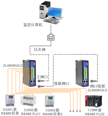 ZLAN5812D可以實(shí)現(xiàn)8路TCP/IP協(xié)議到RS485的轉(zhuǎn)化,8路同時(shí)工作且可以配置為不同的波特率。可實(shí)現(xiàn)通過(guò)網(wǎng)絡(luò)對(duì)485設(shè)備進(jìn)行數(shù)據(jù)采集,網(wǎng)絡(luò)端可以使用虛擬串口連接串口軟件或者直接TCP/IP通訊的軟件。ZLAN2812LD自帶兩個(gè)10M/100M網(wǎng)口,可以任意接一個(gè)網(wǎng)口。另外的一個(gè)網(wǎng)口可以通過(guò)網(wǎng)線實(shí)現(xiàn)多個(gè)ZLAN5812D的級(jí)聯(lián),可以級(jí)聯(lián)為16串口、32串口。