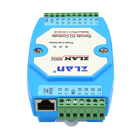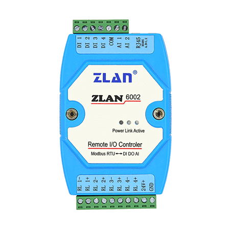 ZLAN6002主要為RS485進行遠程數字量、模擬量的輸入輸出設計的。設備兼容Modbus RTU協(xié)議,可以和組態(tài)軟件、PLC等無縫連接。4路繼電器具有5A@AC250V/DC30V特性,可以驅動大電流設備;4路DI數字量輸入可以為干接點或者濕節(jié)點;2路AI輸入可以為電流量、電壓量、電阻類型的溫濕度傳感器等。