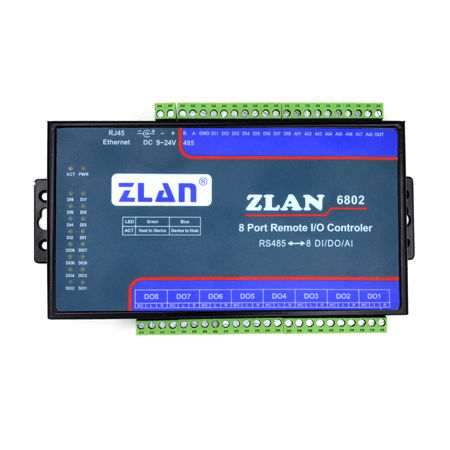 ZLAN6802:這是一款使用RS485總線進(jìn)行控制的IO控制器。和ZLAN6842相比,它只支持Modbus RTU協(xié)議,但是它成本低,適合通過(guò)RS485總線進(jìn)行控制繼電器、采集開(kāi)關(guān)量和模擬量。默認(rèn)波特率為9600bps,波特率也可以設(shè)置。