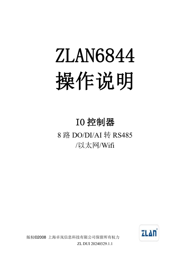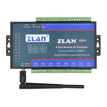 ZLAN6842、ZLAN6802、ZLAN6844是繼ZLAN6042之后上海卓嵐信息科技有限公司推出的8路遠程IO控制器。其控制的路數(shù)從6042 的4路擴展到8路,含有8路DI、8路DO,8路AI輸入。其中DI支持干節(jié)點和濕節(jié)點,帶光耦隔離;DO為繼電器輸出,具有5A 250VAC或5A 30VDC的控制能力;AI輸入中的前4路支持0~5V電壓量輸入,后4路支持4~20mA電流量輸入,精度10位。ZLAN6842、ZLAN6802、ZLAN6844分別支持以太網(wǎng)、RS485、Wifi這3種形式的通信方式。