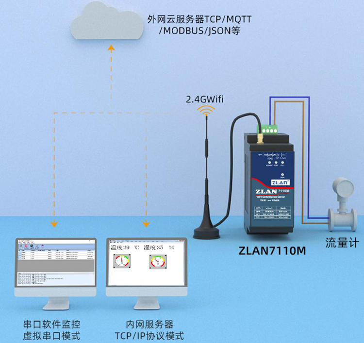 ZLAN7110M是上海卓嵐推出的一款高性?xún)r(jià)比WIFI串口服務(wù)器,實(shí)現(xiàn)RS485轉(zhuǎn)wifi功能。該串口服務(wù)器可以方便地使得RS485串口設(shè)備連接到WIFI無(wú)線(xiàn)網(wǎng)絡(luò),實(shí)現(xiàn)串口設(shè)備的無(wú)線(xiàn)化網(wǎng)絡(luò)升級(jí)。wifi支持STA模式連接到無(wú)線(xiàn)路由器,或者作為AP模式讓手機(jī)等wifi設(shè)備連接。對(duì)于使用虛擬串口的用戶(hù)可使用卓嵐ZLVircom軟件實(shí)現(xiàn)虛擬串口,原有串口PC端軟件無(wú)需修改。也可以使用組態(tài)軟件中的Modbus TCP協(xié)議直接和RTU設(shè)備連接,實(shí)現(xiàn)wifi聯(lián)網(wǎng)通信。
