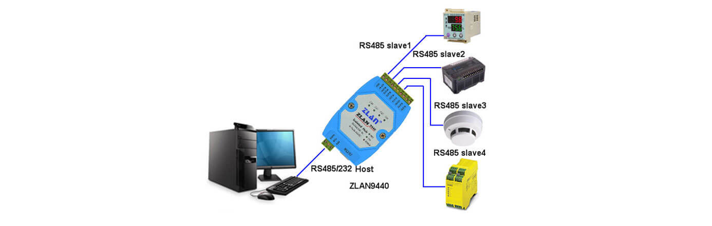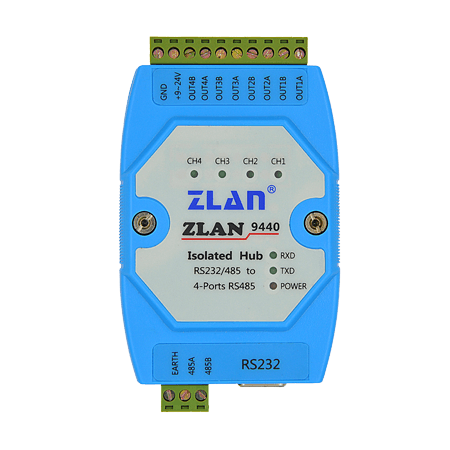 ZLAN9440的主口端同時(shí)提供隔離型RS485和RS232兩種接口,從口端擴(kuò)展出4路隔離型RS485接口。