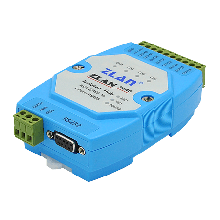 ZLAN9440是一款可通過一路RS485/232主口擴(kuò)展出4路RS485從口的工業(yè)級(jí)隔離型4口RS485集線器??梢杂行У膶?shí)現(xiàn)RS485網(wǎng)絡(luò)的中繼、擴(kuò)展與隔離。ZLAN9440同時(shí)可以作為有源的隔離型的RS232轉(zhuǎn)RS485轉(zhuǎn)換器。如果只需要一路有源隔離型RS232轉(zhuǎn)RS485則型號(hào)是ZLAN9410。如需8口485HUB,請(qǐng)選擇ZLAN9480A。
