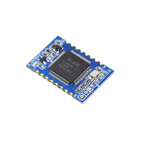 2003T的尾綴T表示采用的是郵票孔的接口,2003T只有單面有元器件,所以可以貼到用戶電路板上,適合SMT工藝集成到用戶電路板。雖然另外一種模塊ZLSN2003S具有更小的體積,但是2003S是雙排針模塊,不適合貼到電路板表面。