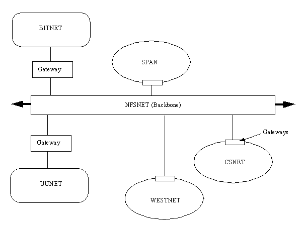 In the United States, the Internet has the NFSNET as its backbone, as shown in Figure 2.4. Among the primary networks connected to the NFSNET are NASA's Space Physics Analysis Network (SPAN), the Computer Science Network (CSNET), and several other networks such as WESTNET and the San Diego Supercomputer Network (SDSCNET), not shown in Figure 2.4. There are also other smaller user-oriented networks such as the Because It's Time Network (BITNET) and UUNET, which provide connectivity through gateways for smaller sites that can't or don't want to establish a direct gateway to the Internet.