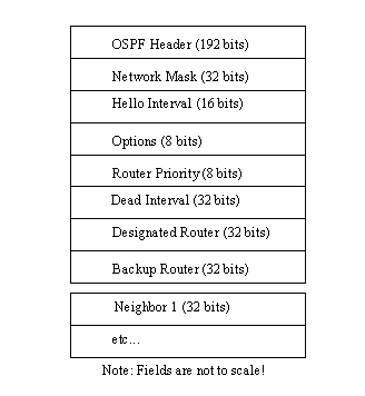 After the OSPF header is the Network Mask field, which is dependent on the interface. The Hello Interval is the number of seconds between subsequent Hello packets from the same router. The Options field is for IP's Type of Service supported values. The Router Priority field defines whether the router can be designated as a backup. If the field has a 0 value, the router cannot be defined as a backup. The Dead Interval is the number of seconds before a router is declared to be down and unavailable. The Designated and Backup Router fields hold the addresses of the designated and backup routers, if there are any. Finally, each neighbor has a set of fields that contain the address of each router that has recently (within the time specified by the Dead Interval) sent Hello packets over the network.