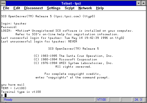 Telnet utilities are available for many different operating systems. Figure 6.3 shows a Windows for Workgroups Telnet application (part of a larger TCP/IP application suite from NetManage called ChameleonNFS, which I look at in much more detail on Day 10, "Setting Up a Sample TCP/IP Network: DOS and Windows Clients") logging into an SCO UNIX server. Even when the local machine has a graphical interface such as Windows, you can most likely connect to remote machines using a character-based interface.