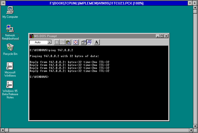 Figure 7.5. The Windows 95 ping utility is DOS-based.